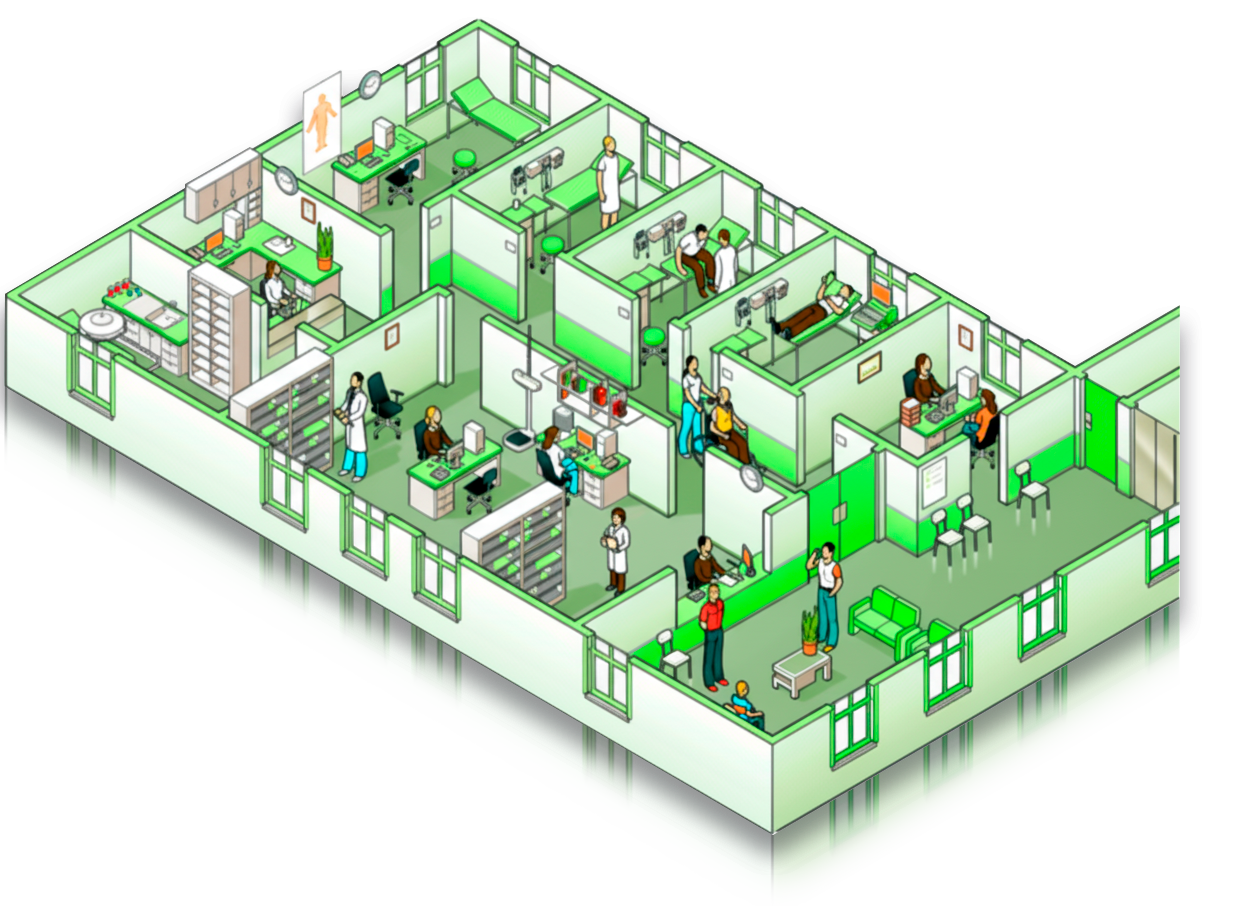 - Tableros visuales de control de pacientes y alertas para tareas asistenciales.